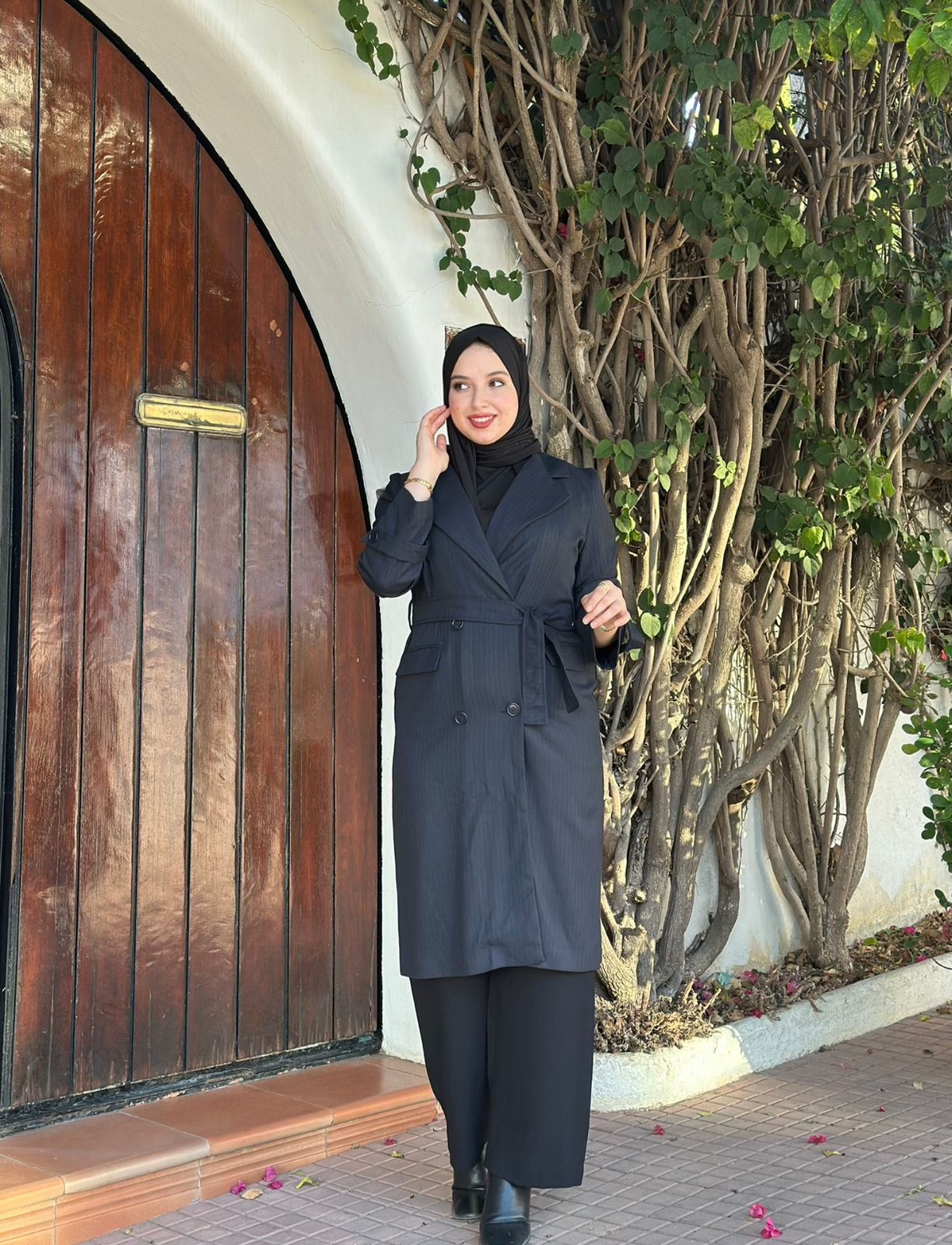 Ce cardigan bleu marine est une pièce classique et polyvalente, tissu avec des rayures en gris, sans doublure, de manches longues et d’un col à revers. Sa coupe normale offre un style classique et élégant, idéal pour un look à la fois classique ou décontracté.
