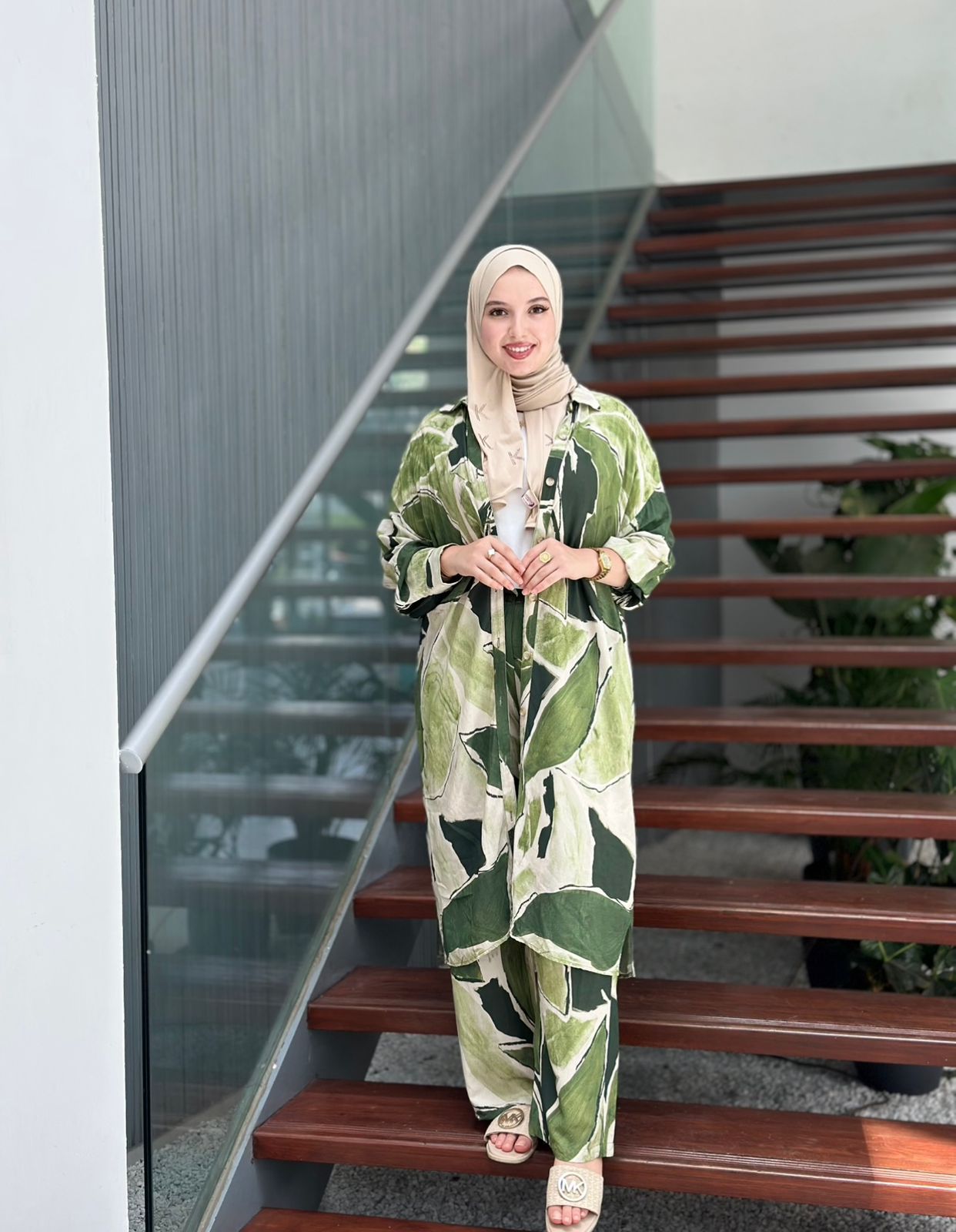 Ensemble vert olive composé d’une chemise à col à revers et manches longues, accompagnée d’un pantalon à ceinture élastique. Élégant, confortable et parfait pour un look décontracté.